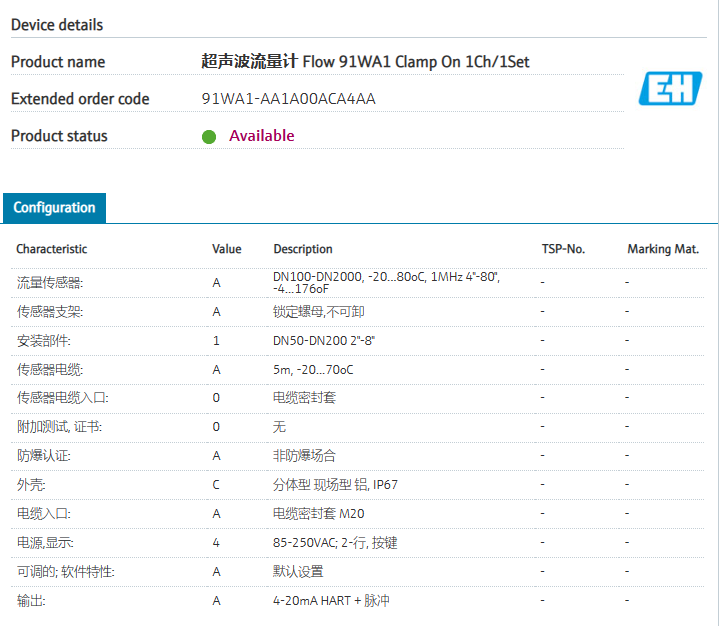 Suitable for hot and cold water流量传感器: A DN100-DN2000, -20...80oC, 1MHz 4"-80", -4...176oF 传感器支架: A 锁定螺母,不可卸 安装部件: 1 DN50-DN200 2"-8" 传感器电缆: A 5m, -20...70oC 传感器电缆入口: 0 电缆密封套 附加测试, 证书: 0 无 防爆认证: A 非防爆场合 外壳: C 分体型 现场型 铝, IP67 电缆入口: A 电缆密封套 M20 电源,显示: 4 85-250VAC; 2-行, 按键 可调的; 软件特性: A 默认设置 输出: A 4-20mA HART + 脉冲