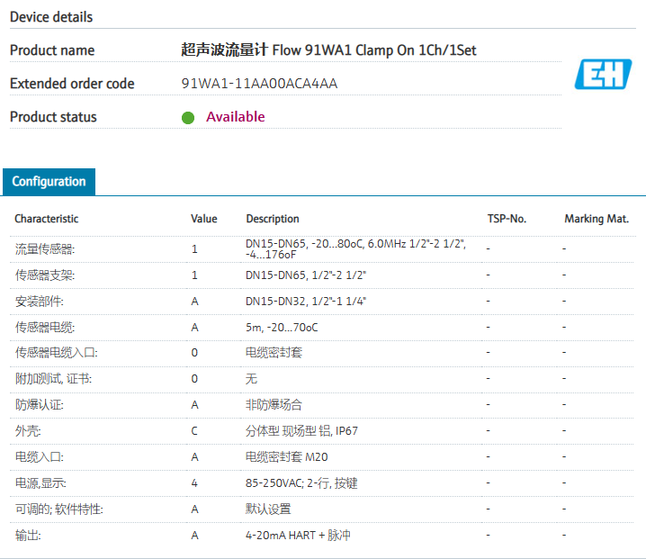 Suitable for hot and cold water流量传感器: 1 DN15-DN65, -20…80oC, 6.0MHz 1/2"-2 1/2", -4…176oF 传感器支架: 1 1DN15-DN65, 1/2"-2 1/2" 安装部件: A DN15-DN32, 1/2"-1 1/4" 传感器电缆: A 5m, -20...70oC 传感器电缆入口: 0 电缆密封套 附加测试, 证书: 0 无 防爆认证: A 非防爆场合 外壳: C 分体型 现场型 铝, IP67 电缆入口: A 电缆密封套 M20 电源,显示: 4 85-250VAC; 2-行, 按键 可调的; 软件特性: A 默认设置 输出: A 4-20mA HART + 脉冲