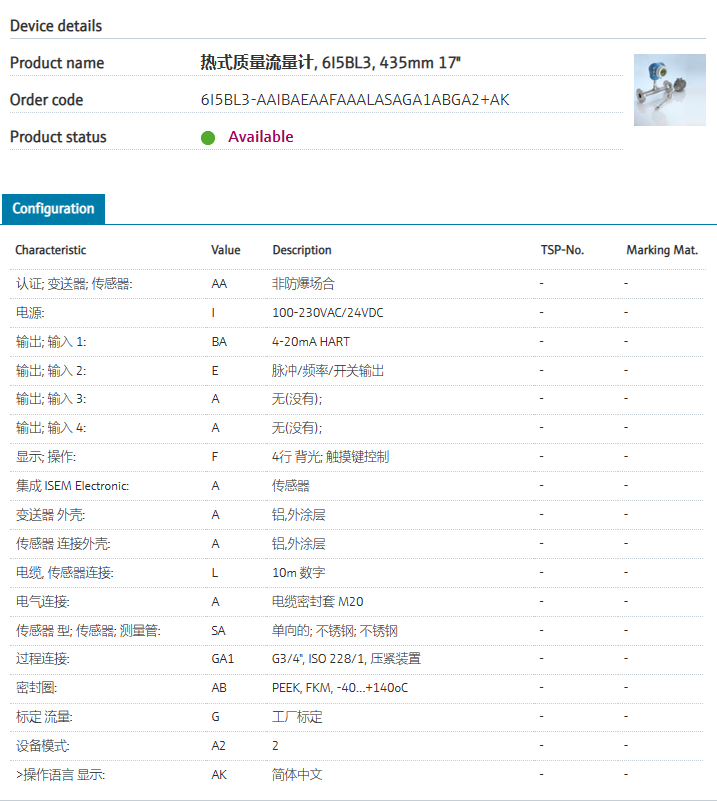 based on 21 standard gases or mixtures.认证; 变送器; 传感器: AA 非防爆场合 电源: I 100-230VAC/24VDC 输出; 输入 1: BA 4-20mA HART 输出; 输入 2: E 脉冲/频率/开关输出 输出; 输入 3: A 无(没有); 输出; 输入 4: A 无(没有); 显示; 操作: F 4行 背光; 触摸键控制 集成 ISEM Electronic: A 传感器 变送器 外壳: A 铝,外涂层 传感器 连接外壳: A 铝,外涂层 电缆, 传感器连接: L 10m 数字 电气连接: A 电缆密封套 M20 传感器 型; 传感器; 测量管: SA 单向的; 不锈钢; 不锈钢 过程连接: GA1 G3/4", ISO 228/1, 压紧装置 密封圈: AB PEEK, FKM, -40...+140oC 标定 流量: G 工厂标定 设备模式: A2 2 >操作语言 显示: AK 简体中文