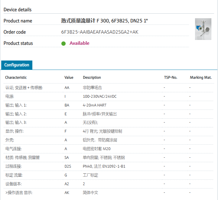 6F3B25-AAIBAEAFAASAD2SGA2+AK 订货号 6F3B25-2T20/0 扩展订货号 (6F3B25-AAIBAEAFAASAD2SGA2+AK) 名称 热式质量流量计 F 300, 6F3B1H, DN100 4" 基本描述 Thermal mass flowmeter
