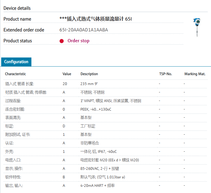 rectangular ducts.插入式 管道 长度: 20 235 mm 9" 材质 插入式 管道; 传感器: A 不锈钢; 不锈钢 过程连接: A 1" MNPT, 螺纹 ANSI, 压紧装置, 不锈钢 连合密封圈: 0 PEEK, -40...+130oC 表面清洗: A 基本型 标定: D 工厂标定 附加测试, 证书: 1 基本型 认证: A 非防爆场合 外壳: 1 一体化 铝, IP67, -40oC 电缆入口: A 电缆密封套 M20 (EEx d > 螺纹 M20) 显示; 操作: A 85-260VAC, 2-行 + 按键 软件特性: B 默认气体; (空气 1.013bar a) 输出, 输入: A 4-20mA HART + 频率
