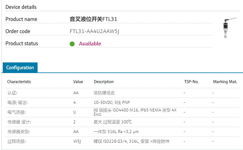 FTL31-AA4U2AAW5J 订货号 FTL31-14X8/0 扩展订货号 (FTL31-AA4U2AAW5J ) 名称 音叉液位开关FTL31 基本描述 点式物位仪 音叉震动式