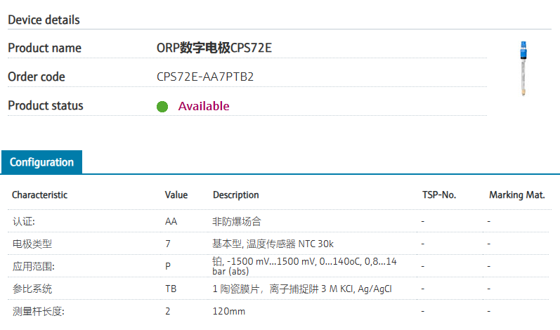 ORP element: platinum.认证: AA 非防爆场合 电极类型 7 基本型, 温度传感器 NTC 30k 应用范围: P 铂, -1500 mV...1500 mV, 0...140oC, 0,8...14 bar (abs) 参比系统 TB 1 陶瓷膜片,离子捕捉阱 3 M KCl, Ag/AgCl 测量杆长度: 2 120mm