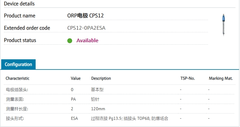 Working limit: max 16 bar电极插装头: 0 基本型 测量表面: PA 铂针 测量杆长度: 2 120mm 接头形式: ESA 过程连接 Pg13.5; 插接头 TOP68, 防爆场合