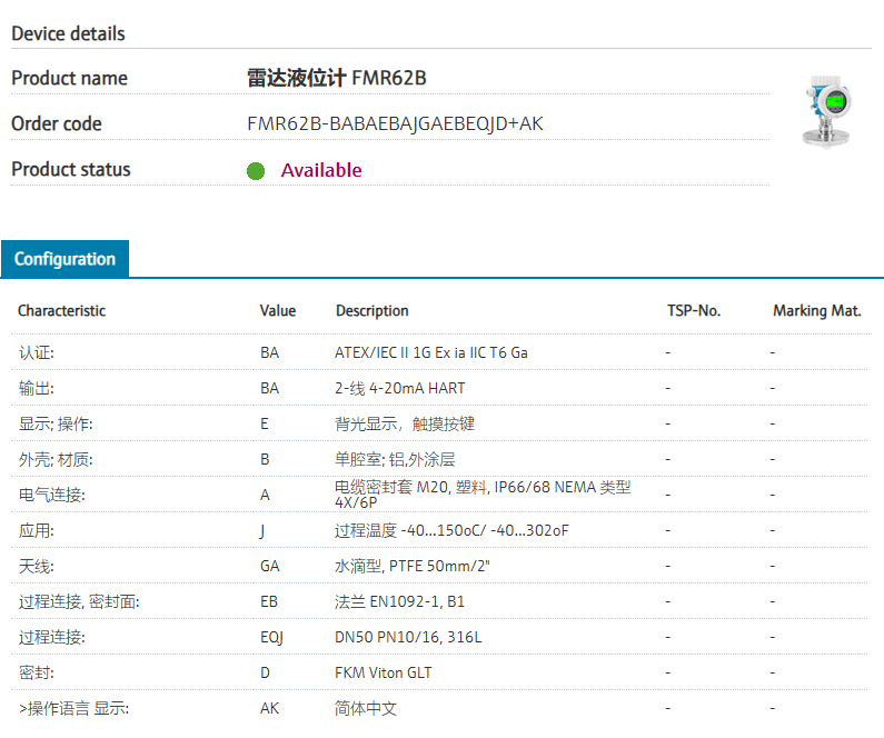 tanks with many obstacles.认证: BA ATEX/IEC II 1G Ex ia IIC T6 Ga 输出: BA 2-线 4-20mA HART 显示; 操作: E 背光显示,触摸按键 外壳; 材质: B 单腔室; 铝,外涂层 电气连接: A 电缆密封套 M20, 塑料, IP66/68 NEMA 类型 4X/6P 应用: J 过程温度 -40…150oC/ -40...302oF 天线: GA 水滴型, PTFE 50mm/2" 过程连接, 密封面: EB 法兰 EN1092-1, B1 过程连接: EQJ DN50 PN10/16, 316L 密封: D FKM Viton GLT >操作语言 显示: AK 简体中文