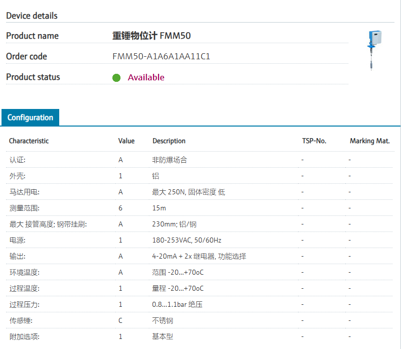 FMM50-A1A6A1AA11C1 订货号 FMM50-3FD3/0 扩展订货号 (FMM50-A1A6A1AA11C1) 名称 重锤物位计 FMM50 基本描述 Level transmitter, continuous.