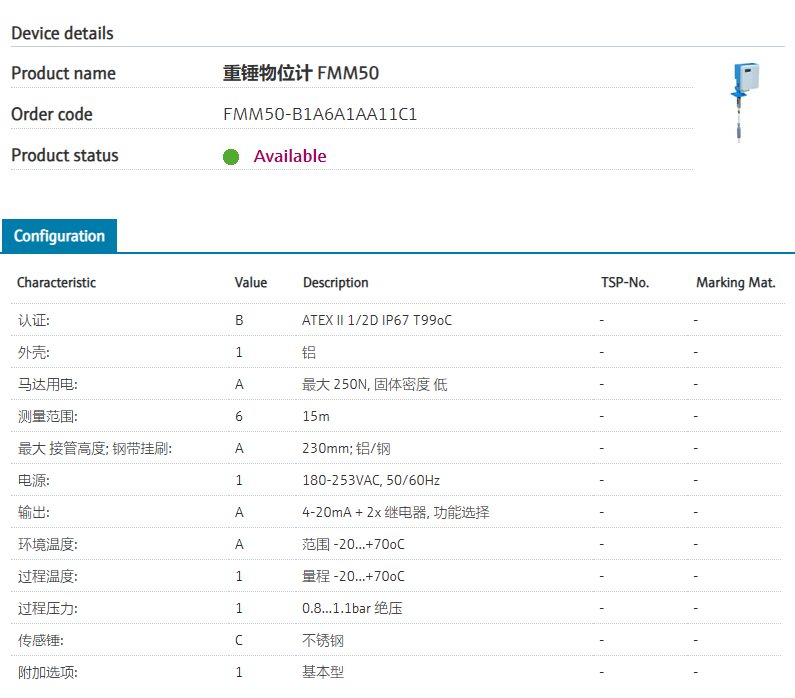 FMM50-B1A6A1AA11C1 订货号 FMM50-3VR4/0 扩展订货号 (FMM50-B1A6A1AA11C1) 名称 重锤物位计 FMM50 基本描述 Level transmitter, continuous.