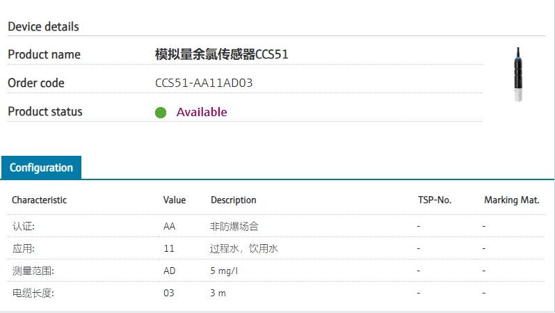 process control, flexible installation认证: AA 非防爆场合 应用: 11 过程水,饮用水 测量范围: AD 5 mg/l 电缆长度: 03 3 m