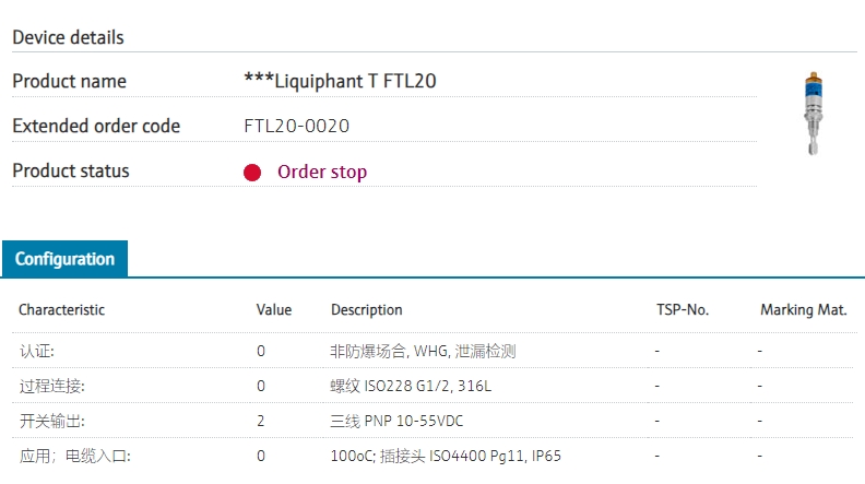 最常用的音叉液位开关,最经济的型号,满足大量液位开关的需求,常备现货,非常经济实惠! 替代FTL20-0020, 非防爆场合 10-30VDC; 3线 PNP 输出 M16霍斯曼接头,螺纹G1/2过程连接