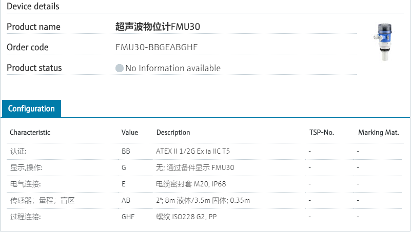 :: 探头自清洁功能认证: BB ATEX II 1/2G Ex ia IIC T5 显示,操作: G 无; 通过备件显示 FMU30 电气连接: E 电缆密封套 M20, IP68 传感器;量程;盲区 AB 2"; 8m 液体/3.5m 固体; 0.35m 过程连接: GHF 螺纹 ISO228 G2, PP 型号参数