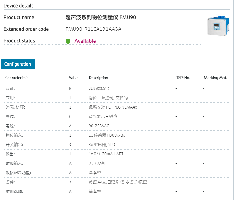 :: Simple guided setup认证: R 非防爆场合 应用: 1 物位 + 泵控制, 交替的 外壳, 材质: 1 现场安装 PC, IP66 NEMA4x 操作: C 背光显示 + 键盘 电源: A 90-253VAC 物位输入: 1 1x 传感器 FDU9x/8x 开关输出: 3 3x 继电器, SPDT 输出: 1 1x 0/4-20mA HART 附加输入: A 无(没有) 数据记录功能: A 基本型 语种: 3 英语,中文,日语,韩语,泰语,印尼语 附加选项: A 基本型 型号参数