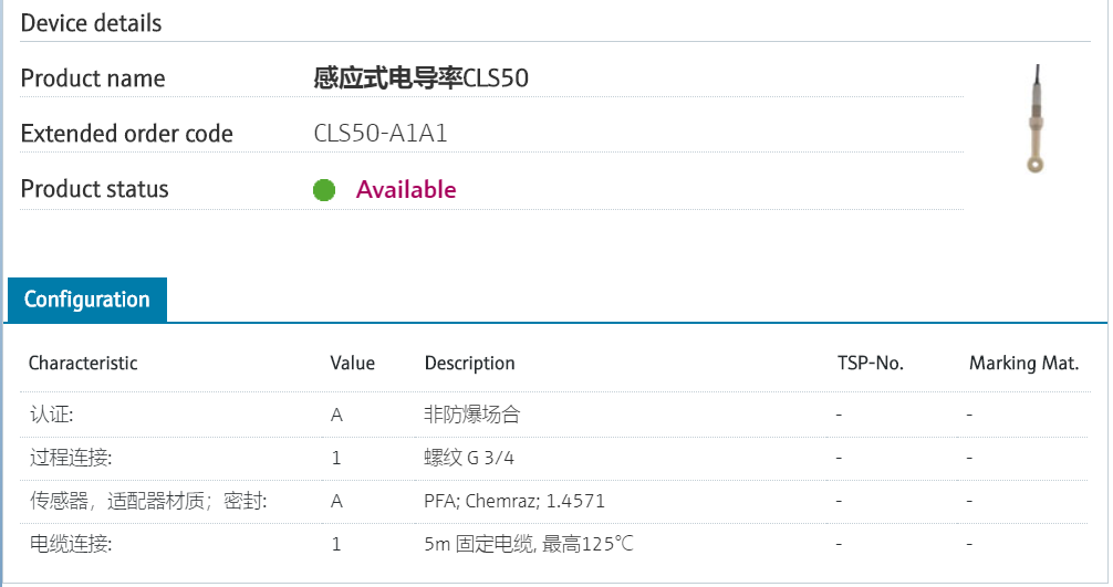 CLS50-A1A1 订货号 CLS50-1009/0 扩展订货号 (CLS50-A1A1) 名称 感应式电导率CLS50 基本描述 Conductivity, inductive sensor.