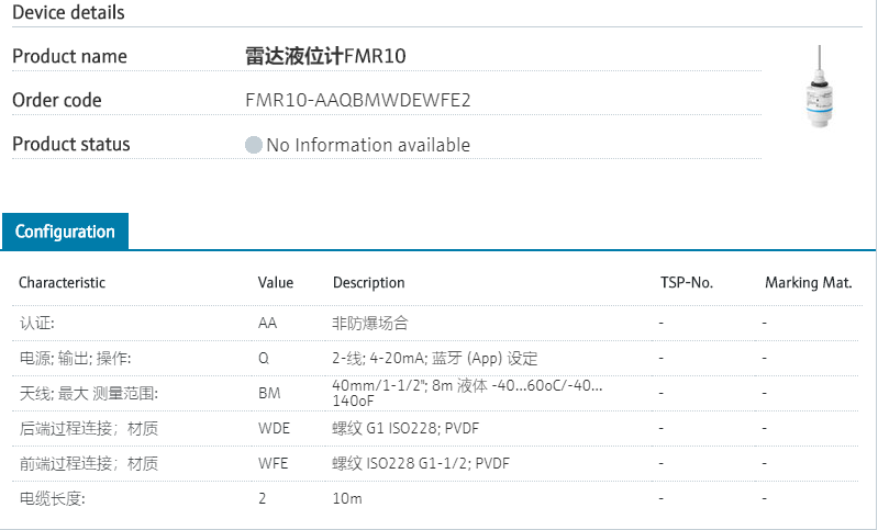 FMR10-AAQBMWDEWFE2 订货号 FMR10-1009/0 扩展订货号 (FMR10-AAQBMWDEWFE2) 名称 雷达液位计FMR10 基本描述 雷达物位仪,非接触式测量