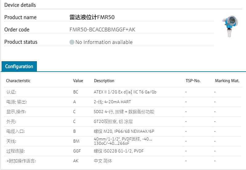 FMR50-BCACCBBMGGF+AK 订货号 FMR50-3VC2/0 扩展订货号 (FMR50-BCACCBBMGGF+AK) 名称 **雷达液位计FMR50 基本描述 "Product being phased out - Limited
