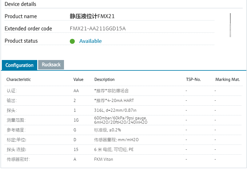 :: Intgerated overvoltage protection.认证: AA *推荐*非防爆场合 输出: 2 *推荐*4-20mA HART 探头: 1 316L, d=22mm/0.87in 测量范围: 1G 600mbar/60kPa/9psi gauge, 6mH2O/20ftH2O/240inH2O 参考精度: G 标准级, ±0.2% 标定;单位: D 传感器量程; mm/mH2O 探头 连接: 15 ..... m 电缆, 可切短, PE 传感器密封: A FKM Viton 型号参数