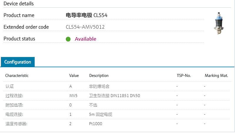 CLS54-AMV5012 订货号 CLS54-10C2/0 扩展订货号 (CLS54-AMV5012) 名称 电导率电极 CLS54 基本描述 Conductivity, inductive sensor