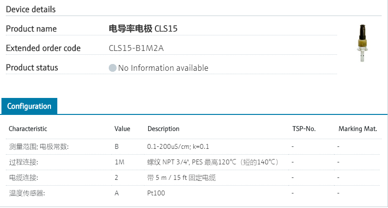 CLS15-B1M2A 扩展订货号 CLS15-B1M2A 名称 电导率电极 CLS15 基本描述 Conductivity 2-electrode sensor.