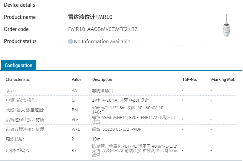 FMR10-AAQBMVCEWFE2+R7 订货号 FMR10-1139/0 扩展订货号 (FMR10-AAQBMVCEWFE2+R7) 名称 雷达液位计FMR10 基本描述 雷达物位仪,非接触式测量
