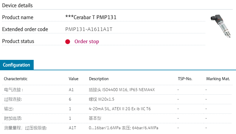 防爆,量程1.6MPa绝压,M20x1.5过程连接,带M16插接头,4-20ma输出 PMP131的型号已经停产,替代型号:PMP21-BA1U1QBX4J