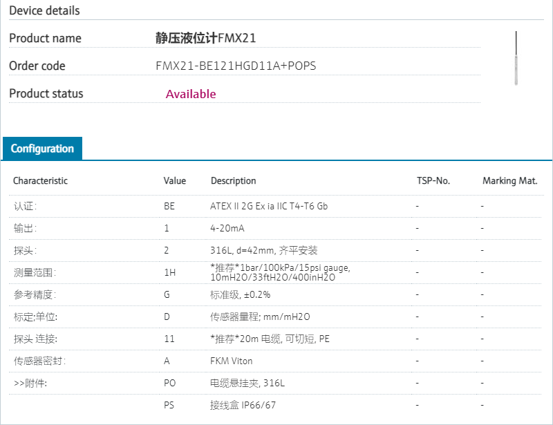 :: Intgerated overvoltage protection.认证: BE ATEX II 2G Ex ia IIC T4-T6 Gb 输出: 1 *推荐*4-20mA HART 探头: 2 316L, d=42mm, 齐平安装 测量范围: 1H *推荐*1bar/100kPa/15psi gauge, 10mH2O/33ftH2O/400inH2O 参考精度: G 标准级, ±0.2% 标定;单位: D 传感器量程; mm/mH2O 探头 连接: 11 *推荐*20m 电缆, 可切短, PE 传感器密封: A FKM Viton 产品型号