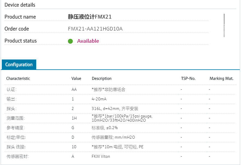 :: Intgerated overvoltage protection.认证: AA *推荐*非防爆场合 输出: 1 4-20mA 探头: 2 316L, d=42mm, 齐平安装 测量范围: 1H *推荐*1bar/100kPa/15psi gauge, 10mH2O/33ftH2O/400inH2O 参考精度: G 标准级, ±0.2% 标定;单位: D 传感器量程; mm/mH2O 探头 连接: 10 *推荐*10m 电缆, 可切短, PE 传感器密封: A FKM Viton 产品型号