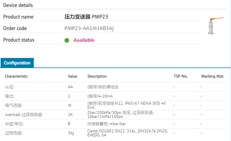 :: 适用于SIP/CIP.认证: AA (推荐)非防爆场合 输出: 1 (推荐)4-20mA 电气连接: M (推荐)航空插座M12, IP65/67 NEMA 类型 4X Encl. overload: 过压极限值 1K 2bar/200kPa/30psi 表压, 过压极限值: 10bar/1MPa/150psi 标定;单位: B 传感器量程; mbar/bar 过程连接: 3AJ Clamp ISO2852 DN22, 316L, DIN32676 DN20, EHEDG, 3A 型号参数
