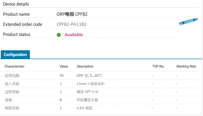 常用的ORP电极,测量范围-1500...+1500 mV,新款替代型号:CPS12E-AA7GAA2