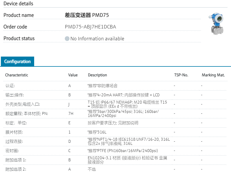 :: Modular.认证: A "推荐"非防爆场合 输出;操作: B "推荐"4-20mA HART; 内部操作按键 + LCD 外壳类型,电缆入口: J T15 铝 IP66/67 NEMA6P; M20 电缆格兰 T15 = 顶部显示 (EEx d 不带格兰) 额定量程; 本体材质; PN: 7H "推荐"3bar/300kPa/45psi; 316L; 160bar/ 16MPa/2400psi 标定;单位: E 按客户要求压力; 见附加说明 膜片材质: 1 "推荐"316L 过程连接: D "推荐"NPT1/4-18 IEC61518 UNF7/16-20, 316L 包含2x 排气排液阀, 316L 密封圈: C "推荐"PTFE (PN160bar/16MPa/2400psi) 附加选项 1: B EN10204-3.1 材质 (接液部分) 检验证书 金属接液部分 附加选项 2: A 不选 型号参数