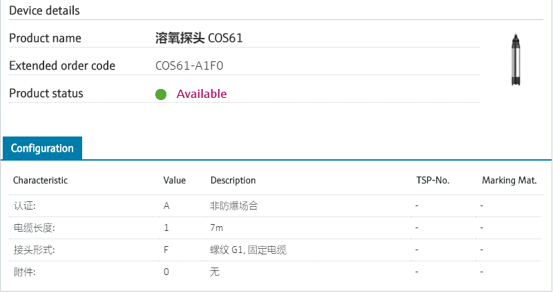 COS61-A1F0 扩展订货号 COS61-A1F0 名称 溶氧探头 COS61 基本描述 Dissolved oxygen sensor, optical.