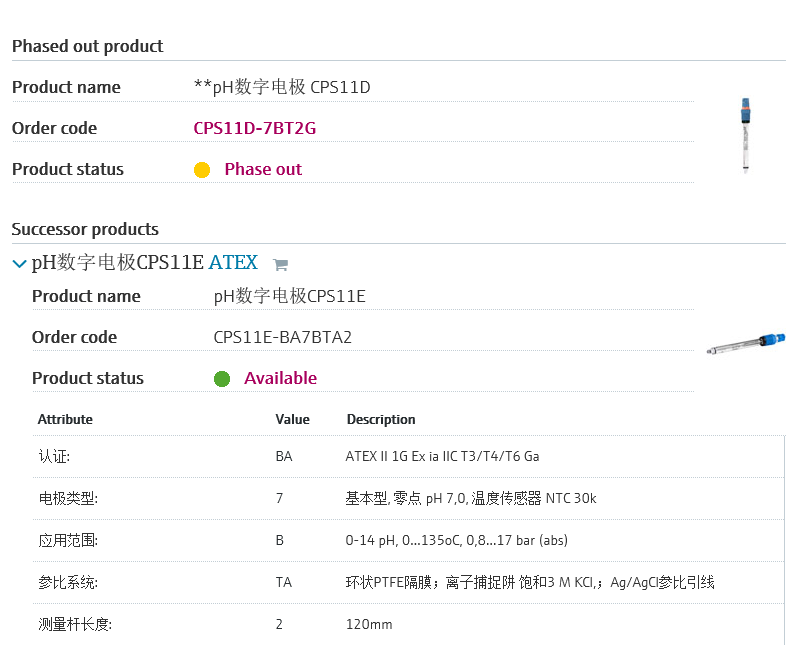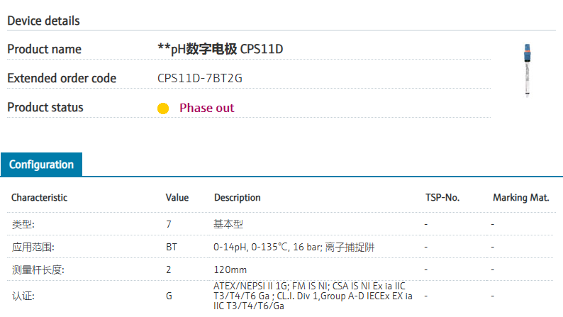CPS11D-7BT2G 0-14pH, 0-135℃, 16 bar; 离子捕捉阱,主要用于化工场合。非防爆的型号为CPS11D-7BT21
