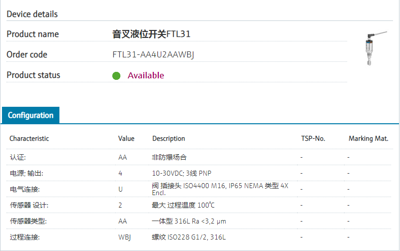 FTL31-AA4U2AAWBJ 订货号 FTL31-11U4/0 扩展订货号 (FTL31-AA4U2AAWBJ) 名称 音叉液位开关FTL31 基本描述 点式物位仪 音叉震动式